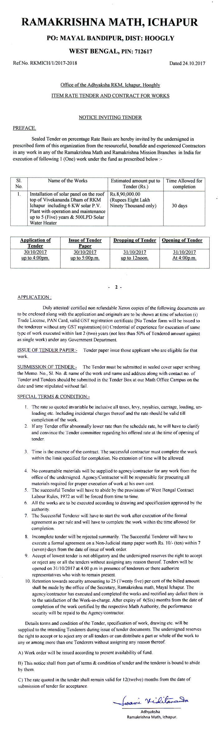 Tender are invited by Ramakrishna Math, Ichapur, P.O. MAyal Bandipur, Hooghly Pin 712617 from bonafide Contructors experienced with works of Ramakrishna Math and Mission to install a 6 K.V. Solar Power Project in Math Premises including internal wiring to different Loads----- Last Date 31.10.2017